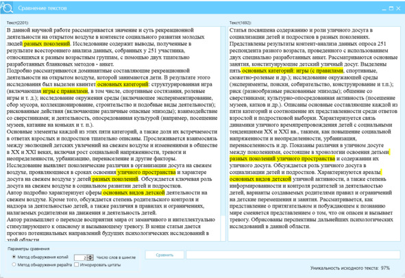 Ссылочный аппарат, содержащийся в текстах, может быть заключён в квадратные скобки – [45, С. 67—71]. Как правило, рерайтеры ссылки не трогают, а если работа написана копипастом, то не трогают точно. Ссылочный аппарат является маркером плагиата. Мы проводили эксперимент – после КонтрПлагиата текст имел отличие Ш2=100%, за счёт ссылочного аппарата текст показывал 100% плагиата, изменили цифры в квадратных скобках, плагиат пропал.