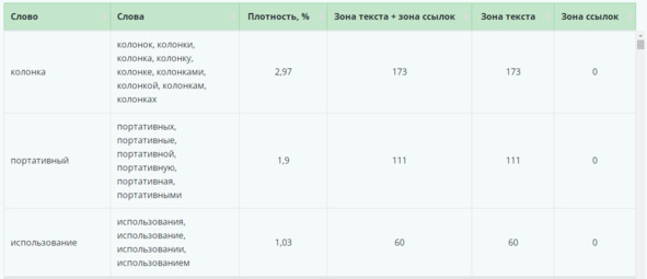 На рисунке 34 представлена частотная характеристика текста, как видно, слово «колонка» разнообразно употреблено 173 раза, на втором месте «портативный», на третьем «использование». Чтобы определить, какие слова чаще всего повторяются в работе, можно воспользоваться сервисом advego, где частные слова будут отражены в колонке. Недостаток сервиса в том, что он не отображает падежи, т.е. если у вас в тексте есть слова «предприятие, предприятием, предприятию» и т.д., Advego напишет лемматизированное слово «предприятие».