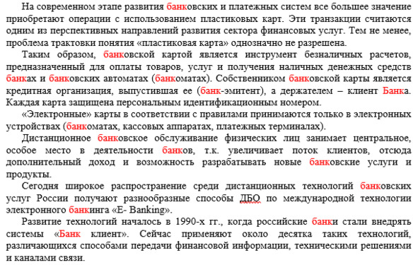 На рис. 35 приведен пример заспамленного текста, где встречаются словоформы от слова «банк».