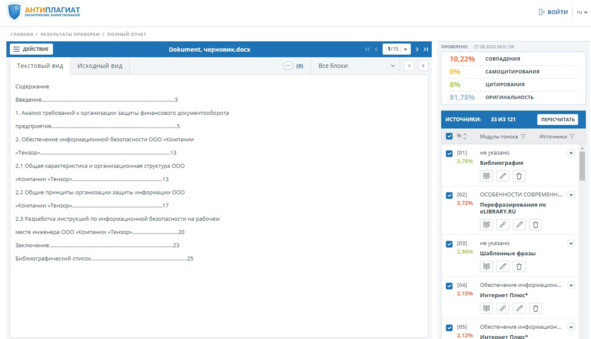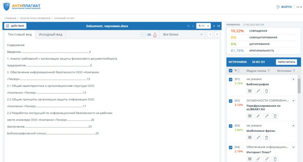 По нашему мнению, Антиплагиат ВУЗ иногда ведет себя как игровая система, ваш отчет о проверке может переспать ночь и изменить показания, рис. 36 и 37.