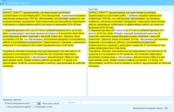 На рис. 40 представлен скриншот перефразированного текста, а на рис. 41 сверка с источником, где в левом окне, текст после рерайта, в правом, источник. Желтым выделено то, что не изменилось.