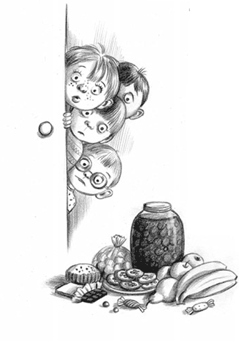 Когда дверь за ребятами закрылась, Васечкин хозяйским глазом окинул гору из кульков, свёртков и банок и, удовлетворённо потерев руки, принялся за клубничное варенье, черпая его из банки большой ложкой.