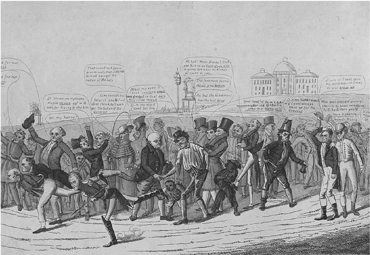 Ни один из кандидатов не набрал нужного большинства голосов в коллегии выборщиков, поэтому предвыборную борьбу перенесли в Палату представителей. Это напряжение предвыборной борьбы изобразил Д. К. Джонстон в карикатуре «Гонки»148. На ней толпа ликующих горожан, наблюдает, как кандидаты Джон Квинси Адамс, Уильям Кроуфорд и Эндрю Джексон приближаются к финишу.