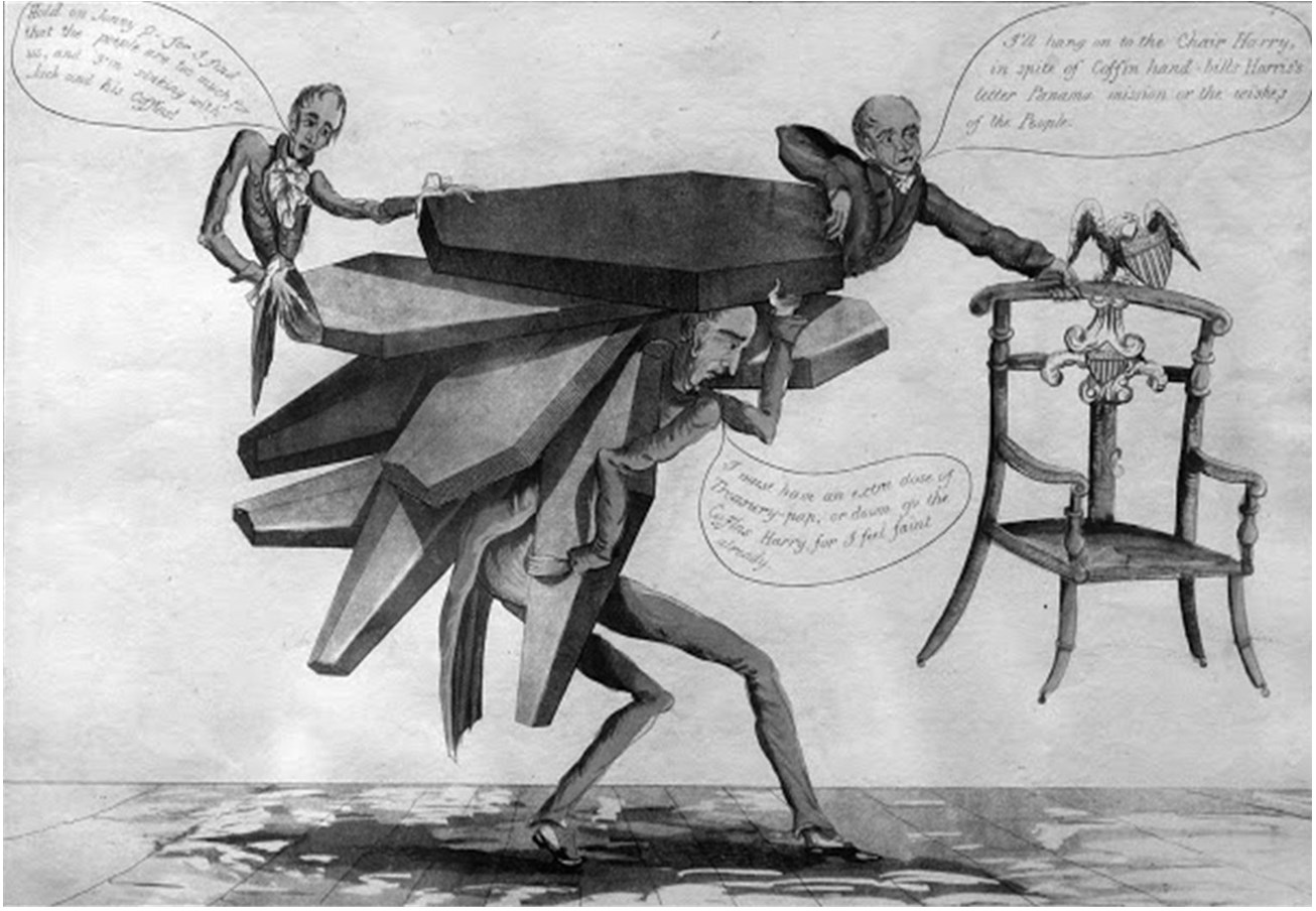 Редактор-издатель Бинс поддерживает на спине большой груз гробов, на которых расположились Генри Клей (слева) и действующий президент Джон Квинси Адамс (справа). Бинс: «Мне нужна дополнительная доза казначейских билетов, папаша, или гробы сползут вниз. Увы, Гарри, я уже чувствую слабость». Клей: «Держись за Джонни К., слишком много людей против нас. Боюсь, я пойду ко дну вместе с Джеком и его гробами!» Адамс (хватаясь за президентское кресло): «Я буду держаться за кресло, Гарри, несмотря на предпочтения народа».