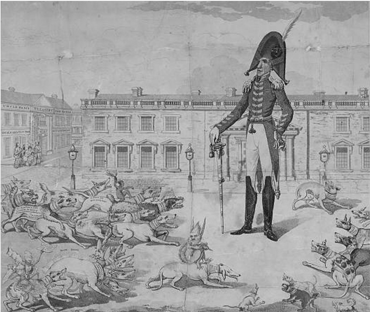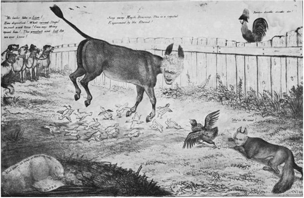 Каждая из псин призвана олицетворять антиджексоновские издания. «The National Gazette» Кроуфорда имеет надпись «британское влияние». «The Pittsburgh Statesman» соответственно отмечен как принадлежащий политикану, сенатору от Пенсильвании Уолтеру Лоури. Пятиголовый пес призван изображать кроуфордовский листок, опубликовавший переписку Эндрю Джексона с Монро 1816 г., в которой Джексон причислял последнего к федералистам внутри республиканской администрации. Собака, сидящая на «Richmond Whig», изображена в виде негритянки, заявляющей о своих пристрастиях к Кроуфорду. «Boston Gazette» нарисована с хвостом в виде трески. «Raleigh Register» помещена в крайнем правом углу за то, что осуждала в самых резких выражениях дуэль Джексона, вступившего за честь своей жены155.