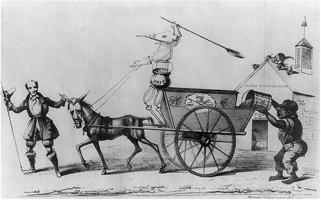 На крыше общественного здания разместились злобно фырчащие кошки. Им не нравится запах, исходящий от телеги, перевозящей отходы. Отходы сливает слуга-негр, на бадье с помоями – аббревиатура «КС» (Kitchen cabinet). Действие происходит напротив уборной, на которой написано «Место для депозитов»160. Возница выглядит более чем фантастично, так как его туловище сооружено из кухонных принадлежностей: тарелок, чайников, утюга, и ухватов, мехов и каминных приспособлений. Лошадь с понурым лицом президента Джексона ведет под уздцы Джек Даунинг.