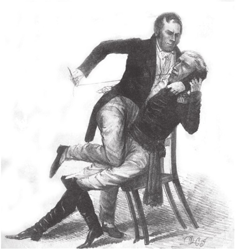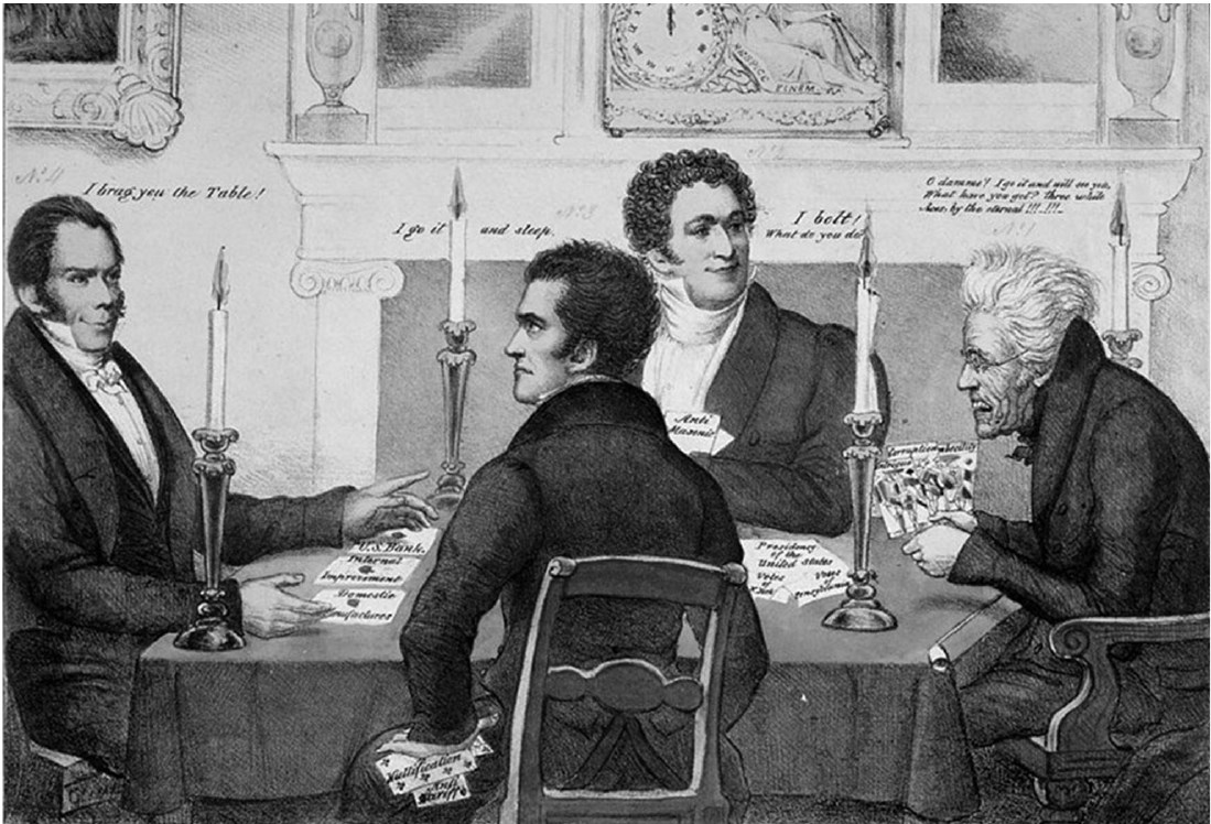 Антагонизм отношений Генри Клея и Эндрю Джексона был отражен в известной карикатуре художника Дэвида Джонстона «Симптомы запертой челюсти. Сделано простым шитьем»190. Карикатура относилась к довольно успешной кампании Генри Клея в Сенате, где он добился, чтобы исключить из журнала палаты протест Джексона, направленный против вынесенного ему порицания Конгресса в связи с его антибанковской политикой.
