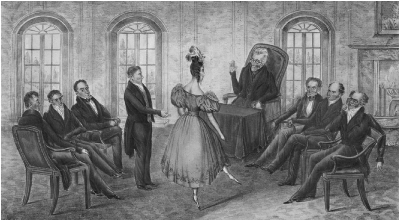 На другом сатирическом листке неизвестный автор решил опять показать, что членов кабинета волнуют не насущные проблемы страны, а поведение жены военного министра Пегги Итон, из-за которой в Белом доме разразился грандиозный скандал161. На рисунке Военный министр представляет Джексону свою жену в присутствии других министров, весьма недовольных сложившейся ситуацией.