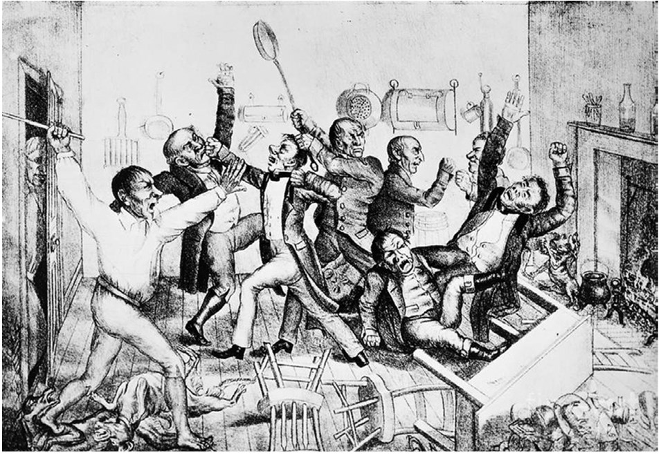 На карикатуре изображена нешуточная потасовка, происходящая именно на кухне Белого дома, причем в ход идут самые разные кухонные принадлежности. А на полу валяются стол и стулья, а также две собаки. Джек Даунинг в белой рубахе, размахивая тростью из орешника гикори163, пытается навести порядок. Сзади него в дверном проеме виднеется фигура самого Джексона.