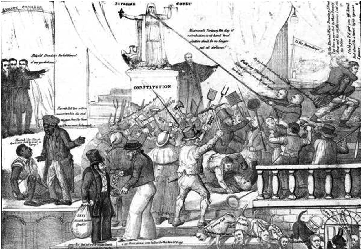 В крайнем левом углу Генри Клей говорит Дэниэлу Уэбстеру и Джону Кэлхуну: «Вот сенаторы, исполнение моих предсказаний!» Ниже под их фигурами художник нарисовал двух черных с их репликами. Один восклицает: «Ура Бобу, еще два или три таких решения, и негр на свободе, ибо больше не будет жратвы»166. Второй: «Ура! массе Гаррисону167, он будет королем!»168