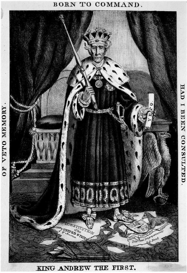 Период пребывания Джексона в должности президента сопровождался усилением президентской власти. В отношениях с Конгрессом президент подчеркивал, что именно он является «народным избранником», выразителем его интересов. Предложения Джексона, как правило, проходили в верхней палате при минимальном перевесе голосов или блокировались. Не случайно, что он использовал право вето 12 раз, т.е. больше, чем все его предшественники169. Не случайно на одной из анонимных карикатур его изобразили в виде монарха. Карикатура называлась «Король Эндрю I»170.