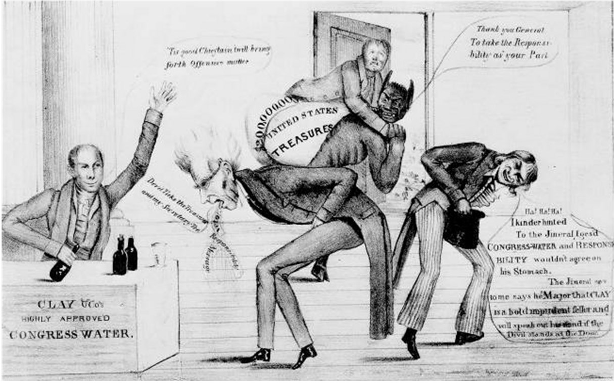В центре Джексон, в темных очках, наклоняется, изрыгая бумаги с надписями «Вето», «Ответственность» и «Послание», в то время как Генри Клей (сидящий за столом, слева) и майор Джек Даунинг (смеющийся, справа) смотрят и комментируют. Клей держит бутылку, только что дав Джексону свою “воду Конгресса”: «Это сильный вождь, он перенесет такое оскорбительное состояние». Согнувшийся от смеха Даунинг: «Я намекнул Джинерлу, что конгрессовская вода и ответственность не будут в согласии с его желудком. Джинерал говорит мне: “Майор, Клей – дерзкий наглец, и он выскажет все, что у него на уме, если в дверях появится Дьявол”». Джексон: «К черту казначейство и моего секретаря»186. Позади него Дьявол удаляется к двери с министром финансов Роджером Тэйни на загривке и мешком с надписью “Сокровища Соединенных Штатов”. Карикатура намекала на отказ Конгресса утвердить Тэйни в качестве министра финансов.
