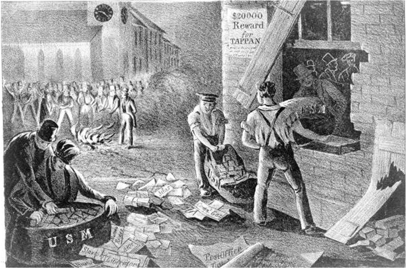 Не обошли своим вниманием карикатуристы и ограничение свободы слова и печати в период «джексоновской демократии». Рисунок неизвестного автора, названный «Новый метод сортировки почты в Чарльстоне, Южная Каролина», показывает, как Юге преследовали аболиционистскую прессу и самих аболиционистов. Генеральный почтмейстер в правительстве Джексона, известный журналист А. Кендалл распорядился, чтобы работники почты на Юге не доставляли аболиционистскую литературу адресатам. Он обосновывал свое решение тем, что каждый номер «Liberator» является «преступной клеветой против Юга, угрозой общественному миру и спокойствию». Почтовые служащие в огромных количествах уничтожали печатную продукцию аболиционистов. В своем письме 7 августа 1835 г. Э. Джексон одобрил решение Кендалла196. Не менее красноречивым свидетельством ограничений аболиционистской агитации, как и в целом прав человека, было принятое Конгрессом «правило кляпа» (gag-rule), названное современниками «законом о затыкании ртов». Согласно ему, разрешалось конфисковать любую литературу, запрещенную к пересылке по почте законами штатов, и автоматически отклонять рассмотрение в Конгрессе любых антирабовладельческих петиций197.