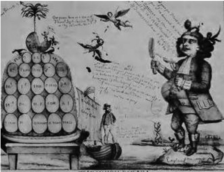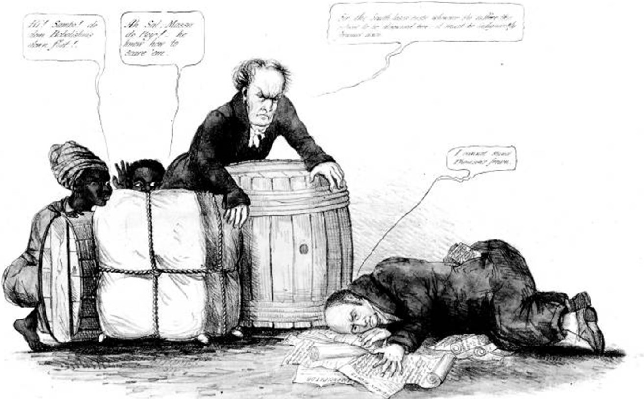 Карикатура неизвестного автора «Аболиционизм ниспровергнут»199 являлась сатирой на закон о «правила кляпа», запрещающий обсуждение вопроса о рабстве. Рост антирабовладельческих настроений на Севере совпал с ростом недовольства южных конгрессменов такими дискуссиями. Она посвящена настойчивой и безуспешной борьбе Джона Квинси Адамса против этого решения. В декабре 1839 г. Палатой представителей было принято новое «правило кляпа», запрещающее дебаты, чтение или даже ссылку на любую петицию по вопросу об отмене рабства.