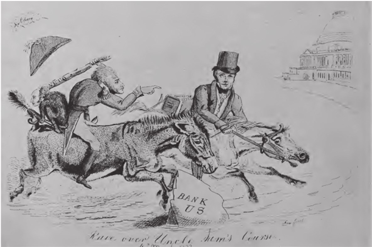 На выборах 1836 г. виги рассчитывали на победу их лидера Генри Клея. В связи с этим появляется довольно забавная карикатура «Гонки курсом дяди Сэма»211 художника Д. К. Джонстона. Карикатура показывает Клея верхом на лошади немного опережающего Джексона. Тот восседает на осле, спотыкающемся о камень с надписью «Банк США».