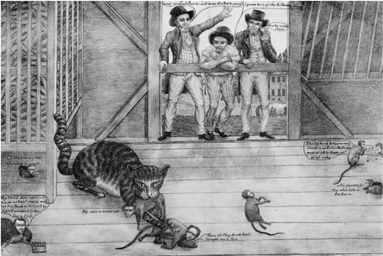 Из открытой двери трое мужчин, Дядя Сэм и его работники, наблюдают за происходящим. Первый мужчина: «Браво, ребята! Держите его в сарае, и, без сомнения, он будет держать крыс подальше». Второй: «Какой у него хвост! Думаю, он из породы Килкенни». Третий: «Как он их забивает!»215