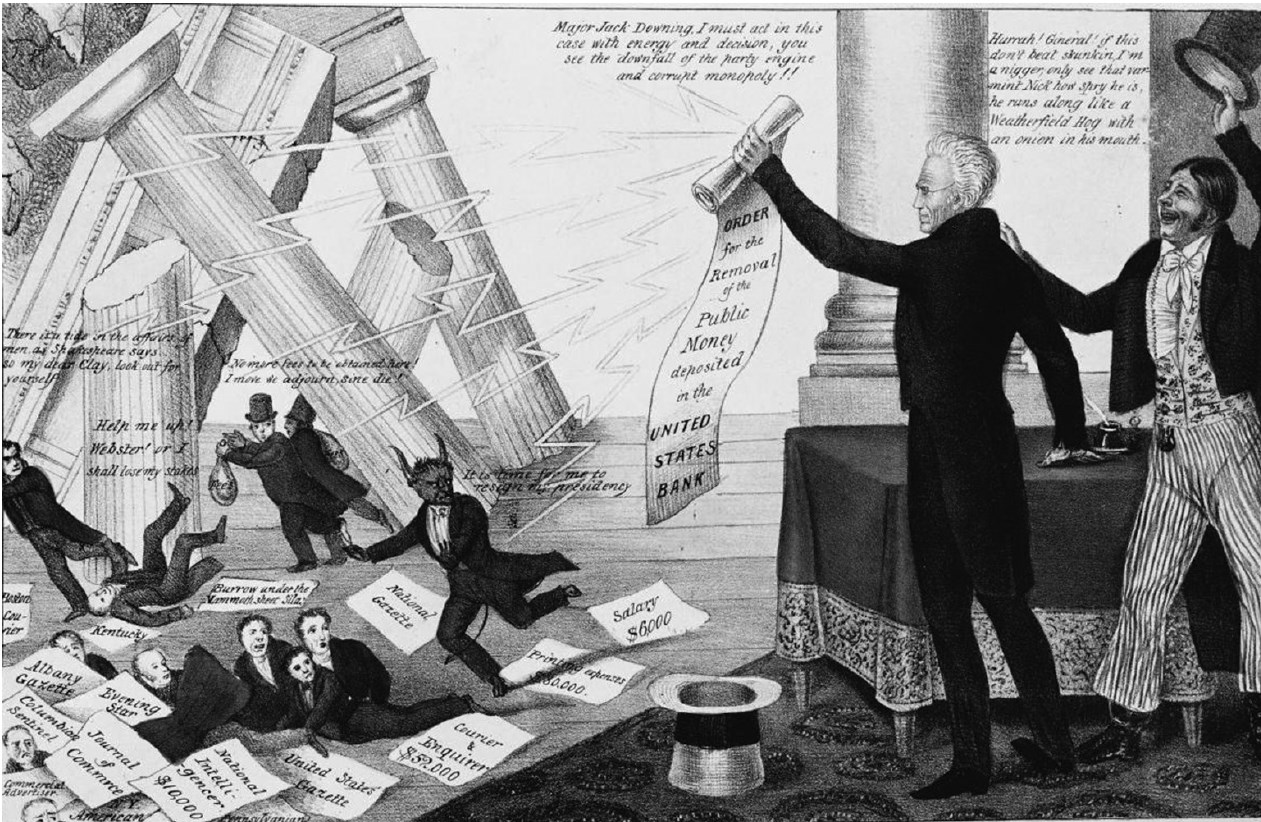 С правой стороны Джексон высоко держит документ с надписью приказ об изъятии федеральных денег, депонированных в банке США. Он говорит: Я должен действовать в этом случае энергично и решительно. И вы увидите уничтожение партийной машины вигов и продажной монополии!!» Вымышленный персонаж майор Джек Даунинг стоит слева от Джексона, размахивая шляпой над головой и одобрительно похлопывая Джексона по плечу: «Ура, генерал! Я буду ниггером218, если это не прикончит скунса. Только посмотрите на этого жалкого Ника. Как он резво бежит, словно кабан с луковицей во рту».