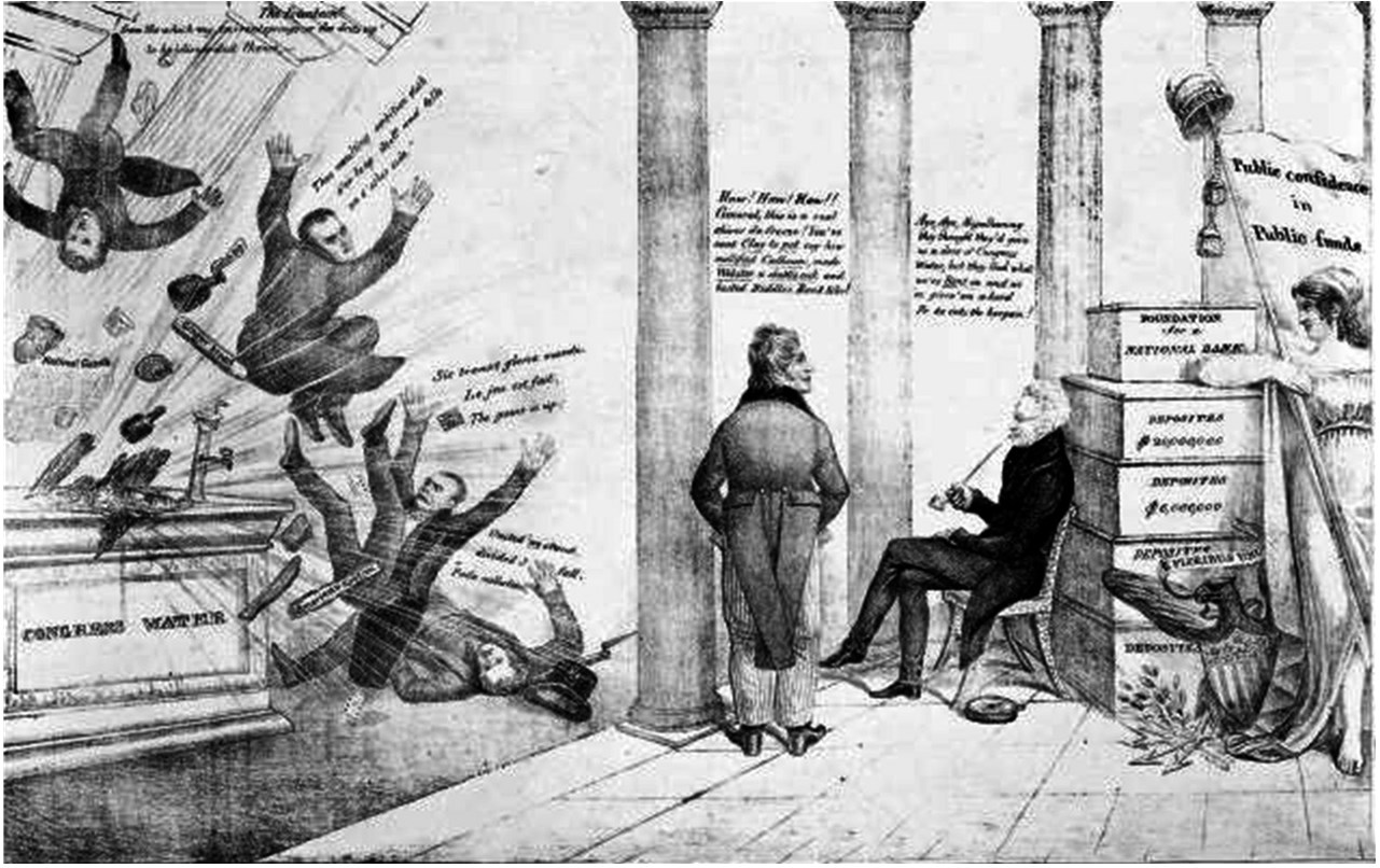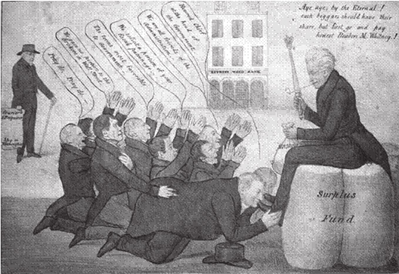 Карикатура художника Генри Робинсона на банки-любимчики называлась: «Попрошайки Седьмого отделения банка»236. На ней президент Эндрю Джексон сидит в позе короля на мешках с деньгами с надписью «резервный фонд». Он держит скипетр и сумку, содержащую 100 тыс. долларов. Чтобы продемонстрировать свое полное спокойствие и безразличие он курит длинную трубку. Двое банкиров стоят на коленях и целуют его ноги, в то время как все остальные подняли руки в мольбе. Репортер из газеты «Courier and Enquirer» наблюдает за происходящим. Здание «Седьмого отделения банка» изображено на заднем плане.