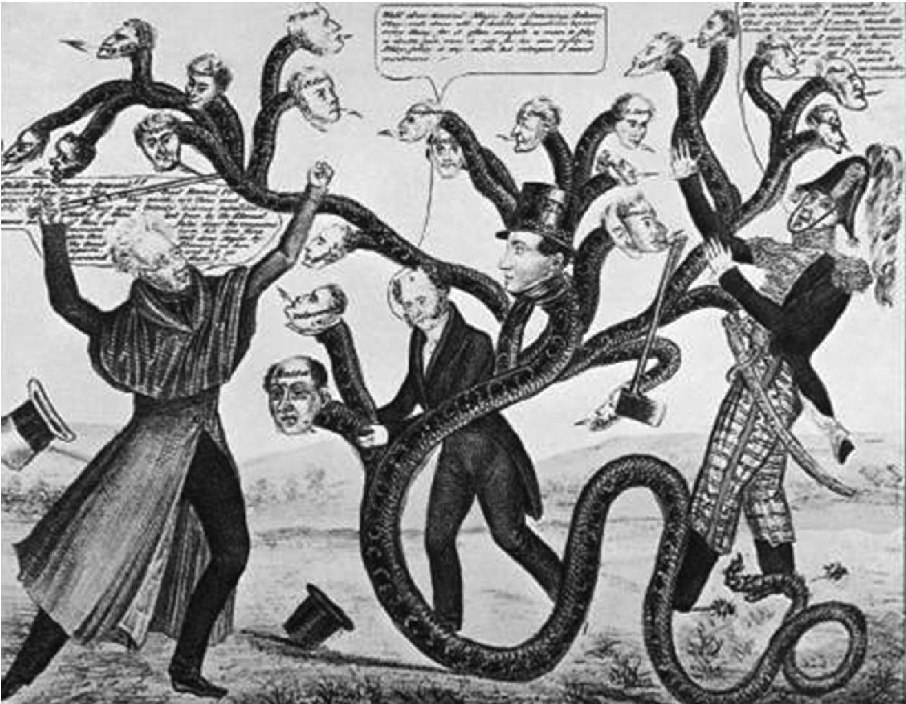 Наиболее известна карикатура Генри Робинсона «Джексон, сражающийся с многоголовым чудовищем» (1836 г.)230.
