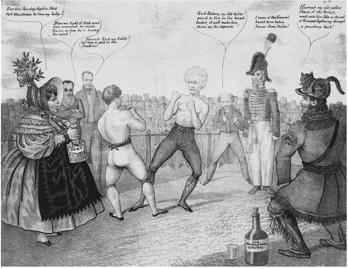 Другая карикатура художника Г. Р. Робинсона представляла излюбленный сюжет бокса между кандидатами. Она называлась: «Боксерский поединок между чемпионом У. Г. Гаррисоном и голландцем из Киндерхука»248.