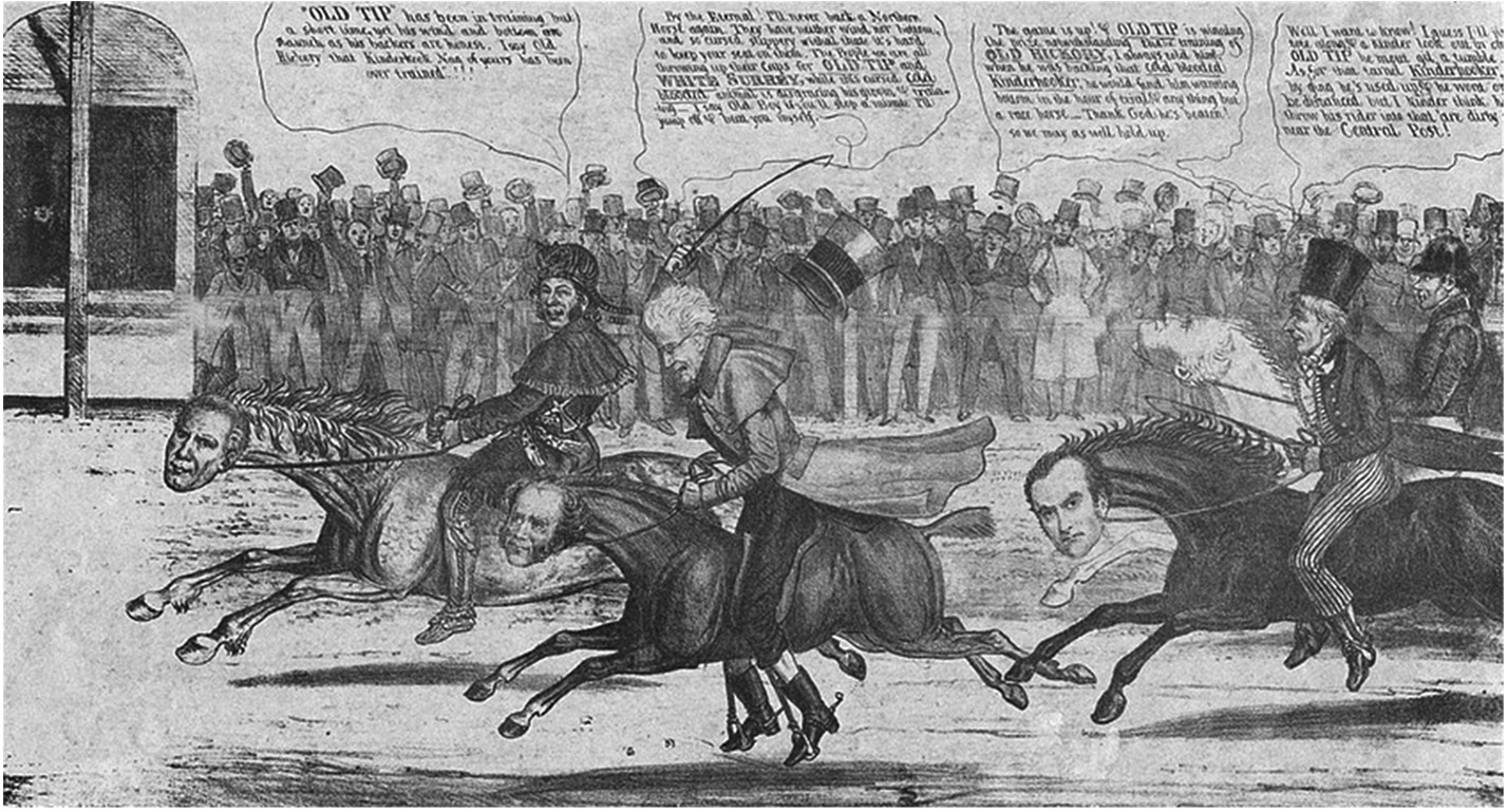 На ней изображены скачки между четырьмя кандидатами. Слева направо: «старый Типпекано»244 (Уильям Генри Гаррисон), «пони из Киндерхука»245 (Мартин Ван Бюрен), «черный Дэн из Массачусетса»246 (Дэниэл Уэбстер) и «Теннесси Уайт» (сенатор от Теннесси Хью Лоусон Уайт). На лошадях с головами кандидатов-вигов восседают фигуры, представляющие различные секционные интересы страны. На Гаррисоне едет фронтирсмен с Запада, на Уэбстере – Джек Даунинг, а на Уайте – жокей, представляющий Юг. На Ван Бюрене, кандидате от демократов, восседает Эндрю Джексон. Толпа приветствует их. Лошадь во главе – Уильям Генри Гаррисон. Его всадник говорит: «”Старина Тип” мало тренировался, однако, на его стороне честные помощники. Я говорю “старине Гикори”, что ваша “кляча Киндерхук” была достаточно натренирована!!!» Джексон (хлещет лошадь и теряет шляпу): «Клянусь вечностью! Я никогда больше не сяду на северную лошадь. Они такие скользкие, что на них трудно удержаться. Люди же бросают свои шапки вверх в честь “Старого Типа”, в то время как это проклятое «хладнокровное» животное позорит своего грума. Я говорю, старина, если ты остановишься на минутку, я спрыгну и побью тебя сам». Южанин: «Игра окончена! “Старый Тип” выигрывает приз, несмотря на то, что “хладнокровный Киндерхук” прошел выучку “старины Гикори”. Слава Богу, он побежден!»247