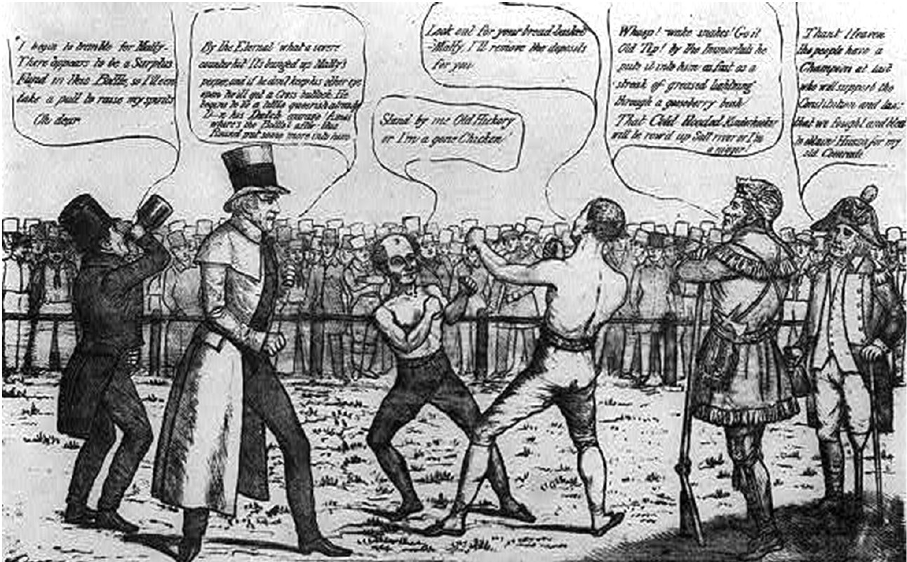 Разумеется, такая трактовка джексоновской антибанковской войны была понятна простым гражданам и усиливала их симпатии к политике президента. Проджексоновская карикатура художника Э. Имберта «Поединок между стариной Гикори и Балли Ником»232 изображала борьбу Джексона с Банком в виде боксерского поединка. (1834 г.).