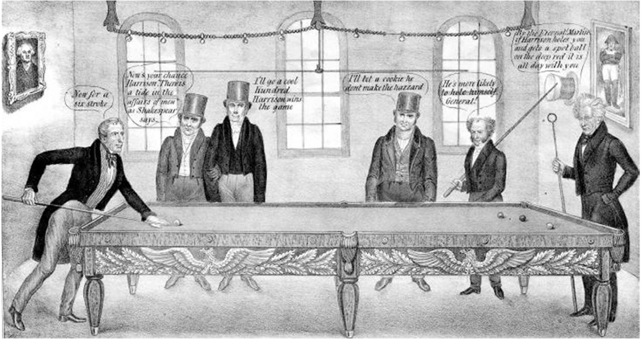 Карикатура изображает соперников играющими в бильярд. При этом автор явно на стороне Гаррисона, рядом с которым на стене он изобразил портрет Джорджа Вашингтона. Недалеко от Ван Бюрена изображен Эндрю Джексон, рядом с которым на стене висит портрет Наполеона. Наблюдают за игрой со стороны Гаррисона сенаторы-виги Генри Клей и Дэниэл Уэбстер. Рядом с Ван Бюреном сенатор демократ Томас Харт Бентон.