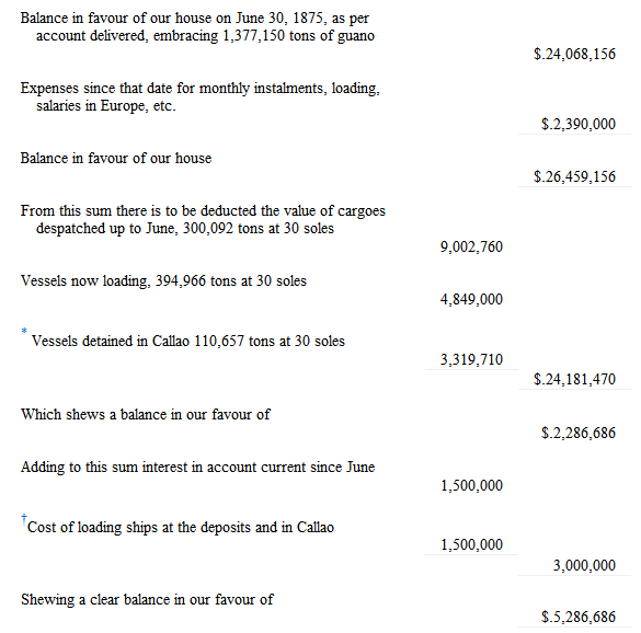 Dreyfus, Hermanos, & Co.Lima, Dec. 31, 1875.It appears from this statement*, that Dreyfus had already put in their claim for the detention of the ships. What is meant by the last item marked with a † is uncertain; no ships are loaded in Callao. If the Government can sustain its suit against Dreyfus on that part of the second article of the contract mentioned above, instead of its owing Dreyfus the 'clear balance of 5,286,686 dols.' Dreyfus is in debt to the Government.