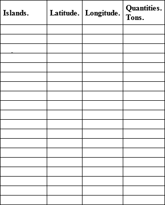 There are eight distinct deposits in an island rather more than a mile in length and half a mile in width. The amount of guano will be not less than 650,000 tons.