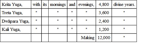 One year of mortals is equal to one day of the gods. 12,000 divine years are equal to a period of four Yugas, which is thus made up, viz.: