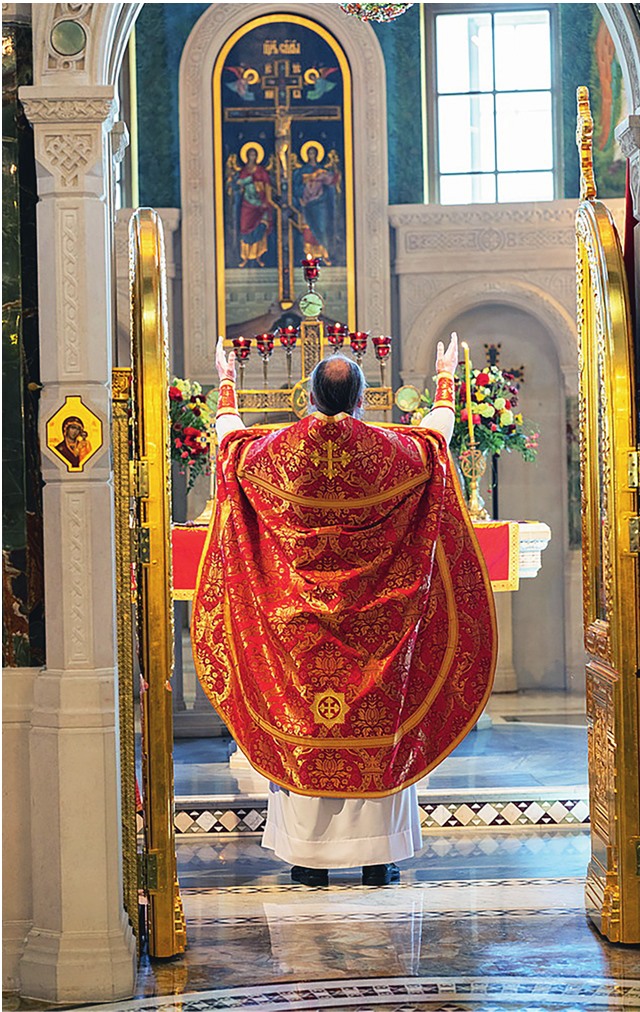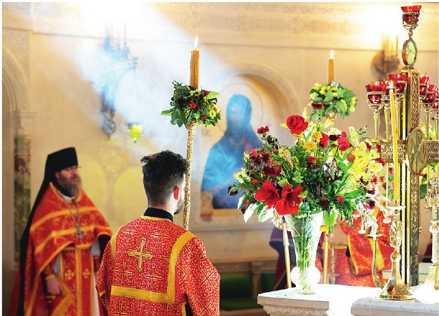 И когда в красном с золотом пасхальном облачении, с распущенными по плечам волосами, с горящим трехсвечником в руке он вышел на амвон, чтобы трижды, на три стороны света подать свой возглас: «Христос воскресе!», облачение батюшки показалось мне одеянием его та́инственного воскресения и уже зримой славы.