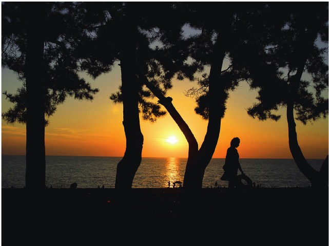 По ярко освещенной, выстланной плиткой сосновой аллее вдоль погасшего моря гуляет нарядная толпа. Островки открытых кафе выхвачены из сумрака призрачным светом и музыкой.