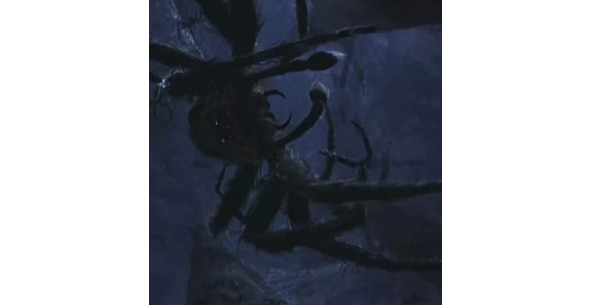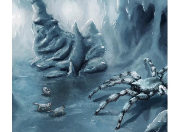 Огромная ловчая сеть паука, натянута между горами, полупрозрачными нитями, словно канат, сам паук с одноэтажный дом с крышей и трубой. Его восемь шерстеных огромных ног, держали на высоте его тело словно огромную каплю в центре нарисованным знаком в форме квадрата. Восемь глаз следили за всем, что находиться между горами, на его территории. Хелицеры капая ядом на конце огромных сочленённых клыков готовясь нанести смертельный удар дракону.