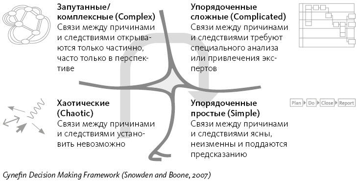 И наконец, четвертый вид систем – хаотические (chaotic). Они и есть хаотические: причины, следствия, что с чем связано – все вообще неясно. Как ни анализируй, все равно не поймешь. Да и, как мы узнаем позже, анализировать здесь нечего, надо действовать.