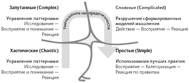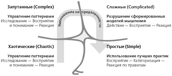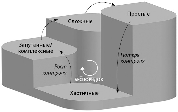 Контексты постоянно перетекают друг в друга. Смена переходит по часовой стрелке. Самая опасная зона находится между простым и хаотичным контекстом. Когда вы уверены, что все просто и понятно, вдруг наступает потеря контроля – «обрыв самоуверенности». Часто это происходит мгновенно (ситуация знакома многим водителям: все тебе было просто, понятно и под контролем, но вдруг что-то пошло не так).