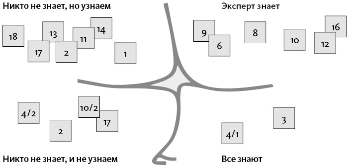 Вначале все стикеры были наклеены в центре листа, в домене «беспорядок», а потом в рамках брейнсторминга брали каждый и обсуждали: ясно ли, что с этим делать. Если всем ясно, то стикер шел в правый нижний угол. Если понятно, что без глубокого анализа, без экспертов не разобраться, – в правый верхний, и так далее.