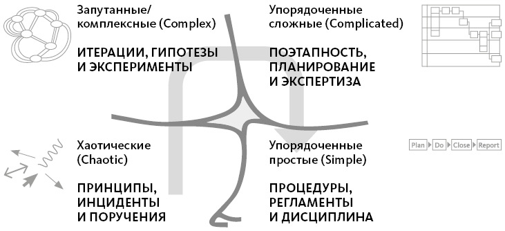 Любая управленческая теория или модель полезна настолько, насколько она позволяет помочь в работе, в принятии решений. Дейв Сноуден не только предложил разделение систем на домены, но и сразу сформулировал, как действовать в каждом из них. Давайте рассмотрим на примерах (рис. 2.3).