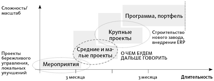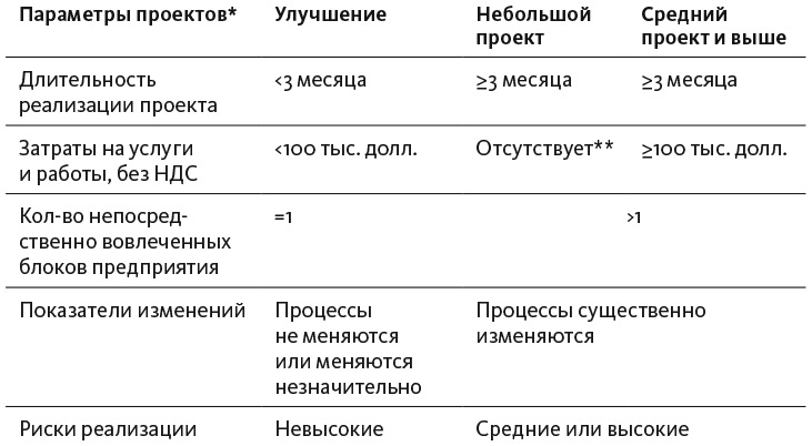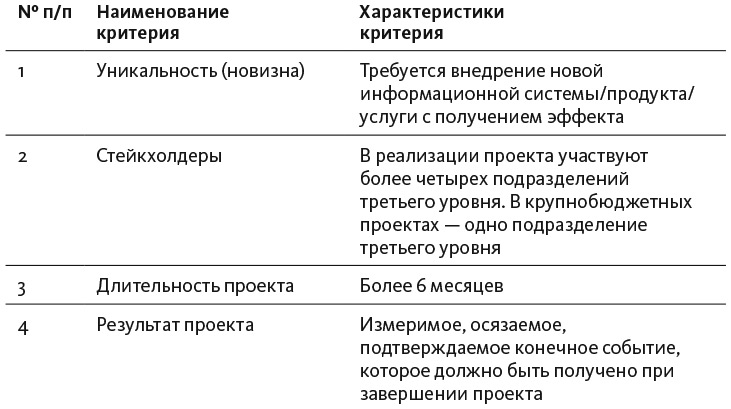 Учитывая все эти особенности, в организациях обычно прописывают некоторую границу, выше которой необходимо применять проектный подход. Обычно это комбинация нескольких параметров: длительность, затраты, количество вовлеченных подразделений, рискованность и так далее. И если по этим параметрам деятельность оказывается достаточно масштабной, ее заворачивают в проектную рамку (табл. 3.1).