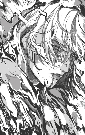 Жеро мечется в беспамятстве. Его лицо покрывает золотая чешуя, а изо рта торчат клыки. Длинными когтями он вырывает огненные цветы и бесповоротно сходит с ума.