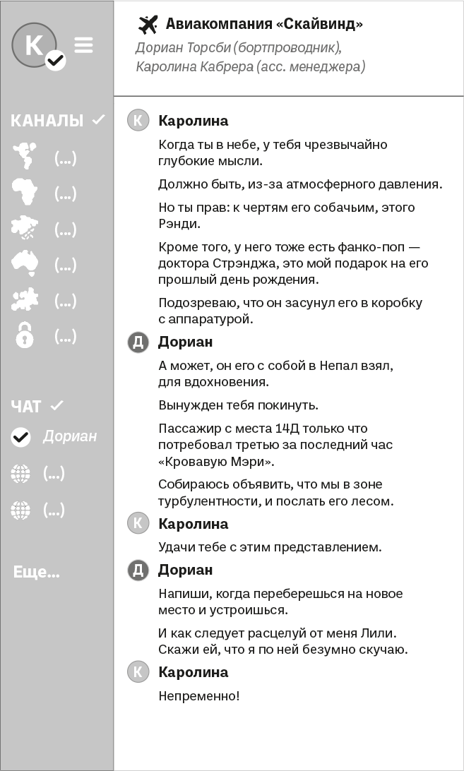 Дориан расхохотался, а за ним Каролина, не в силах сдержаться, прыснула с набитым ртом. Вдвоем они представляли собой любопытное зрелище: два тела, распростертые в креслах для отдыха, окруженные пивными бутылками, шоколадом и фастфудом. Они наблюдали, как за окном садился транспортный самолет. Негромко зазвучала обычная для этой зоны аэропорта мелодия, которую Каролина слушала несколько раз на дню. Прикрыв на секунду глаза, она почувствовала себя как дома.