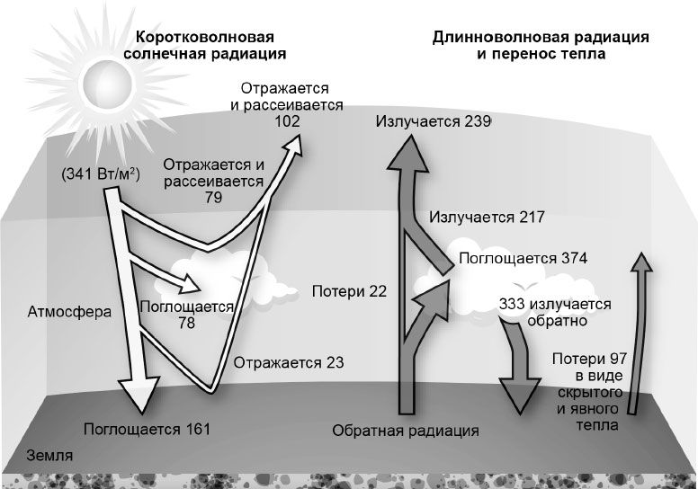 Изучение климата планеты естественно начать с ее энергетического баланса. Земля получает энергию от Солнца. Тепловой поток из недр Земли невелик, от сотых до десятых долей ватта на квадратный метр. Составляя тепловой баланс, им можно пренебречь; это же касается и космического излучения.