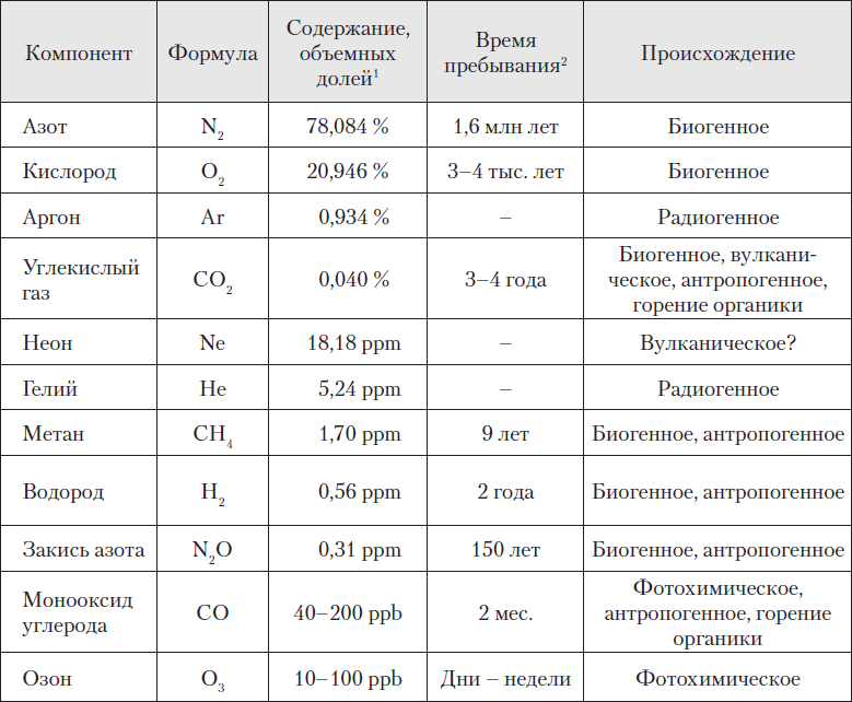Газовый состав атмосферы сформировался в результате ее эволюции; об этом будет более подробно рассказано в главе 3. Состав воздуха в масштабах нашей жизни можно считать постоянным. Большинство компонентов находятся в динамическом равновесии – сколько убывает, столько же и пополняется за счет тех или иных процессов. Исключение составляют лишь те, количество которых быстро растет в результате хозяйственной деятельности человека; в первую очередь это углекислый газ и метан.