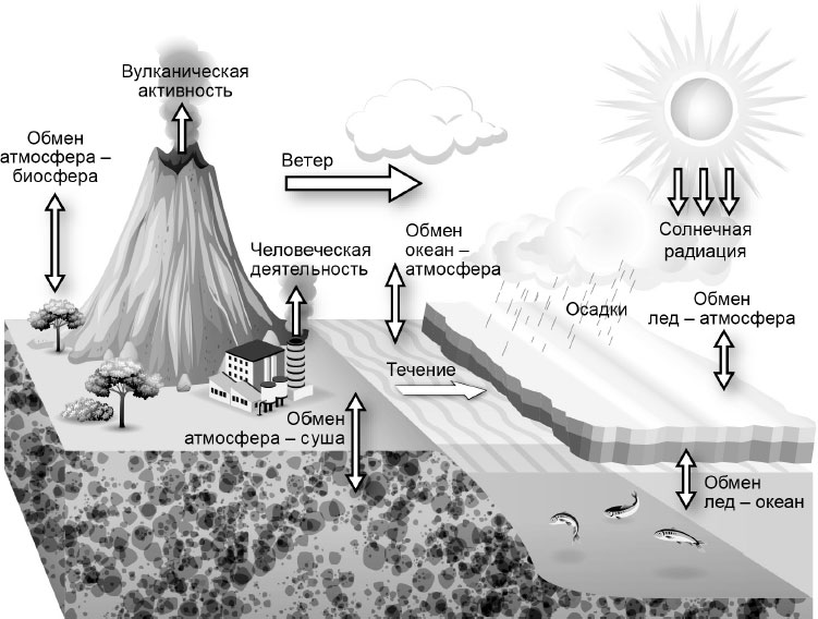 Когда мы говорим о климате, мы подразумеваем в первую очередь состояние атмосферы, точнее, ее нижнего слоя – тропосферы. Это неудивительно, поскольку воздух и есть наша среда обитания, а поверхности Земли мы касаемся лишь подошвами ног. Атмосфера постоянно обменивается энергией и веществом с гидросферой, сушей, криосферой и биосферой (рис. 1.6). Вместе они образуют климатическую систему. Атмосфера является самой динамичной составляющей климатической системы, поскольку обладает относительно небольшой массой и низкой теплоемкостью. Поэтому она реагирует на внешние изменения быстро – от нескольких часов до недель.