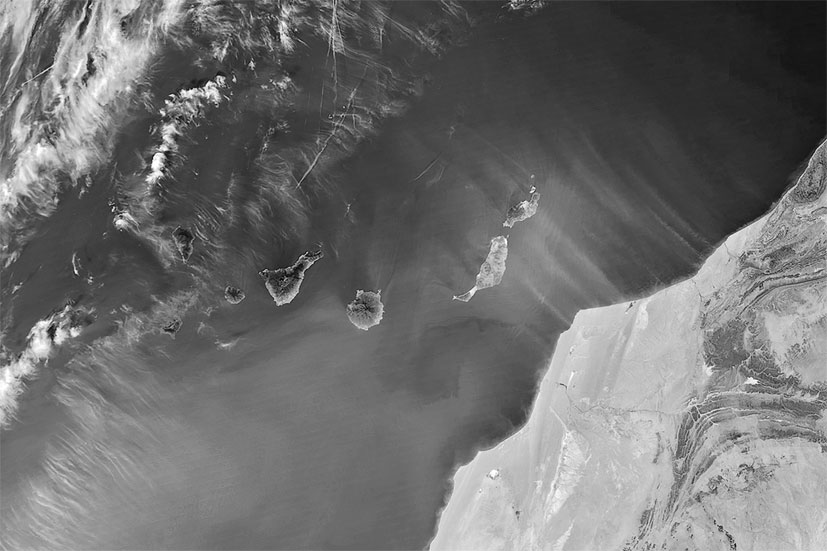 Рис. 1.8. Миллионы тонн пыли из Сахары переносятся ежегодно ветром через Атлантику (Yu et al., 2015). Содержащийся в пыли фосфор – ценное удобрение для лесов Амазонки. Приведенный пример является прекрасной иллюстрацией того, что в климатической системе все взаимосвязано. Аэрозоли также поглощают и рассеивают солнечное излучение и служат ядрами конденсации водяных капель, способствуя образованию облаков. На фото – пыль из Сахары над Канарскими островами. Источник изображения: NASA