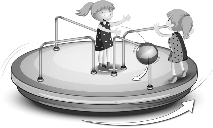 Рис. 1.11. Девочки на карусели. Для наблюдателя во вращающейся системе мяч летит по дуге