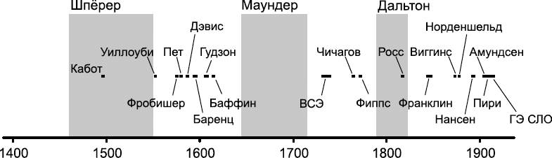 Также на шкале показаны минимумы солнечной активности. Нетрудно заметить, что большая часть полярных экспедиций пришлась на период активного Солнца