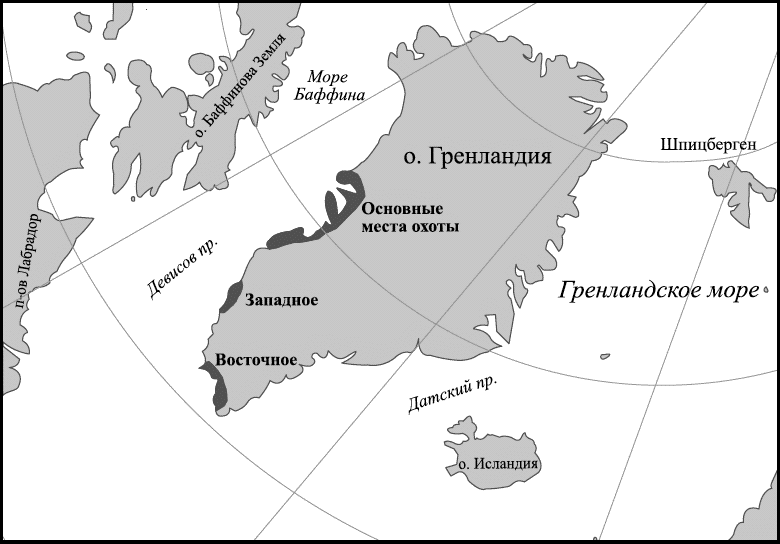 Возможно, именно консервативный менталитет гренландцев помешал их адаптации в меняющемся мире. Основным мотивом к заселению Гренландии было освоение новых земель для животноводства, и именно его гренландцы рассматривали как основу жизненного уклада. Поэтому и селились они преимущественно во внутренних частях фьордов – местах с более тёплым микроклиматом и пышной растительностью, но вдали от открытого моря. Охота же для гренландцев носила вспомогательный характер, они охотились на тюленей в период их сезонной миграции в мае-июне. Охота была общественным занятием – в ней были задействованы все свободные руки и плавсредства. Пути миграции тюленей проходили на север вдоль западного побережья острова – в стороне от поселений гренландцев (рис. 1–6). Это создавало дополнительную сложность: не имея дерева и железа, гренландцы не могли строить надёжные суда, необходимые для охоты.