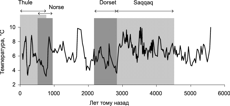 Рис. 1–7. Ход температур в озёрах Гренландии, восстановленный по содержанию ненасыщенных алкенонов. Датировка отложений проводилась радиоуглеродным методом. Заселение Гренландии началось примерно 4,5 тыс. лет назад (Саккакская культура). Примерно 2800 лет назад Саккакская культура была сменена Дорсетской, которая исчезла примерно 2200 лет назад. Исчезновению культур всякий раз соответствовало резкое похолодание. До появления викингов Гренландия оставалась необитаемой. Через 200 – 300 лет после них в Гренландии появились предки нынешних эскимосов (культура Туле) [146]. Видно, что на период викингов пришлось резкое похолодание. Эскимосы, заселившие остров, сумели лучше адаптироваться к неблагоприятным климатическим условиям