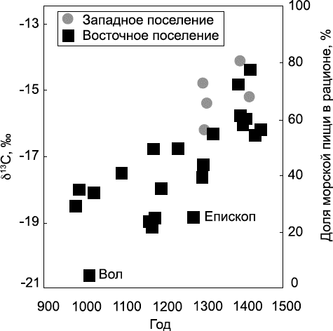 Поначалу поселенцы старались сохранять примерно тот же уклад жизни, что и их родственники в Исландии и Норвегии, но его приходилось приспосабливать к существенно более суровым условиям острова. Экономика гренландцев была построена на сочетании скотоводства и охоты и была достаточно устойчивой. Несколько столетий им удавалось адаптироваться к похолоданию. Нехватку кормов в неблагоприятный год можно было скомпенсировать охотой на оленей и морских животных. Но постепенно сокращался и без того короткий вегетационный период, и всё большую роль в жизни колонистов стала играть охота на тюленей. Это подтверждается изотопией углерода в костях гренландцев – морская пища содержит больше тяжёлого углерода 13C в сравнении с «сухопутной». Видно, что доля морской составляющей (в основном это мясо тюленей) выросла за время существования колонии примерно с 20 до 80 % (рис. 1–8).