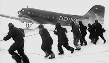 Негостеприимный полюсПервая ледовая база развернута 9 апреля, к 20-му апреля организованы ещё три точки, и 23 апреля, стартовав с базы № 3 (800 км севернее о. Врангеля), самолёты И. И. Черевичного, И. С. Котова и В. И. Масленникова вышли в район полюса. Под крыльями машин – огромное пространство всторошенного льда с сетью трещин и разводий, – следами недавних подвижек и сжатий (РГАКФД, кинофильм «К центру Арктики», ч. 1.). Круг за кругом делают самолёты в поисках места, пригодного для посадки. Проходит полчаса… час… Флагманский борт несколько раз пролетает над узкой полосой молодого «серого» льда и идет на посадку. За ним с тревогой наблюдают с воздуха. Касание… пробежка… остановился, не выключая моторов… рулит в сторону, освобождая полосу для посадки других машин. Советские самолёты впервые опускаются на макушку планеты. Научная группа (М. Е. Острекин, П. А. Гордиенко, П. К. Сенько,